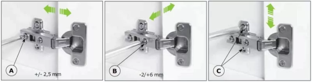 - Usługom serwisowym nie podlegają proste czynności, które użytkownik może wykonać we własnym zakresie np. wymiana żarówki, regulacja zawiasów, dokręcenie poluzowanej śruby, usunięcie zabrudzeń itp. Podstawowe możliwości regulacji zawiasów meblowych: